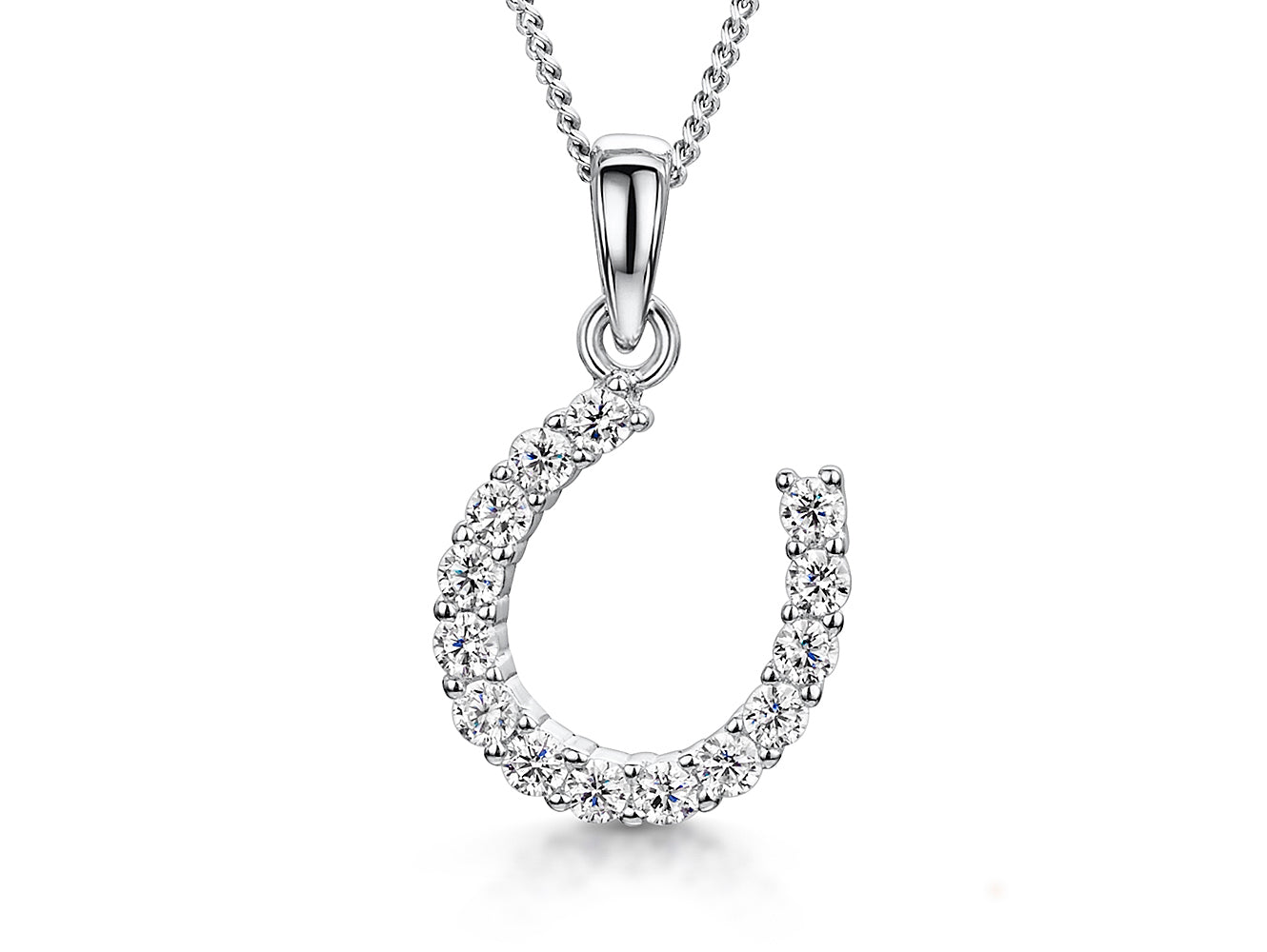 Sterling Silver Horseshoe Pendant Four Claw Set With 2 MM Cubic Zirconia Stones. 20 MM Long. 4 Claw Set. The Finest AAA Grade Stones .925 Sterling Silver- Hypoallergenic. Rhodium Finished For Tarnish Free Wear. Supplied On A 16-18 inch Adjustable Chain. Comes With Gift Packaging.