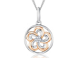 Sterling Silver and Rose Gold Plated Flower Circle Pendant  Featuring An Open Circle With CZ Curved Lines.  15 X 22 in Diameter. 18ct Gold Vermeil On Sterling Silver. The Finest AAA  Grade Cubic Zirconia Stones. Comes On a 16-18 inch Adjustable Silver Chain. Rhodium Finished For Tarnish Free. Supplied with Gift Packaging.