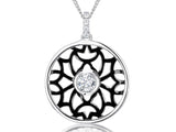 Sterling Silver Circle Pendant With A Ruthenium Filigree Centre Feature And A Cubic Zirconia Centre Stone. Overall Diameter 21 X 27mm . Rhodium finished- Tarnish Free.  Finest AAA CZ Stones. Comes on A 16-18 Inch Silver Chain. Supplied With Gift Packaging