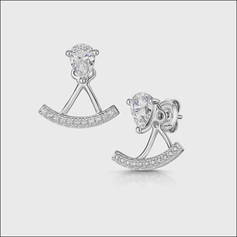 Elegant Sterling Silver Cubic Zirconia Pear Bale Earrings featuring a 5x7mm pear-shaped stud with a sparkling row of 1.25mm AAA-grade cubic zirconia stones. These versatile under-lobe jacket earrings measure 16x16mm and detach to reveal a stunning solitaire stud for dual styling options. Crafted from hypoallergenic 925 silver with rhodium finishing to resist tarnish, these luxury earrings deliver premium sparkle with everyday durability. Presented in gift packaging, perfect for special occasions or personal indulgence.