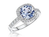 Sterling Silver Ring Set with An 8mm Cushion Cut Blue Topaz  Zirconia Stone with a White Stone Surround. 3 Cushion Carat Weight with Stone Set Shoulders. 925 Silver- Hypoallergenic. The Finest AAA Cubic Zirconia Stones. Rhodium Finished for Tarnish Free Wear. A Ring Sizer Is Provided With Your Order. Supplied With Gift Packaging.