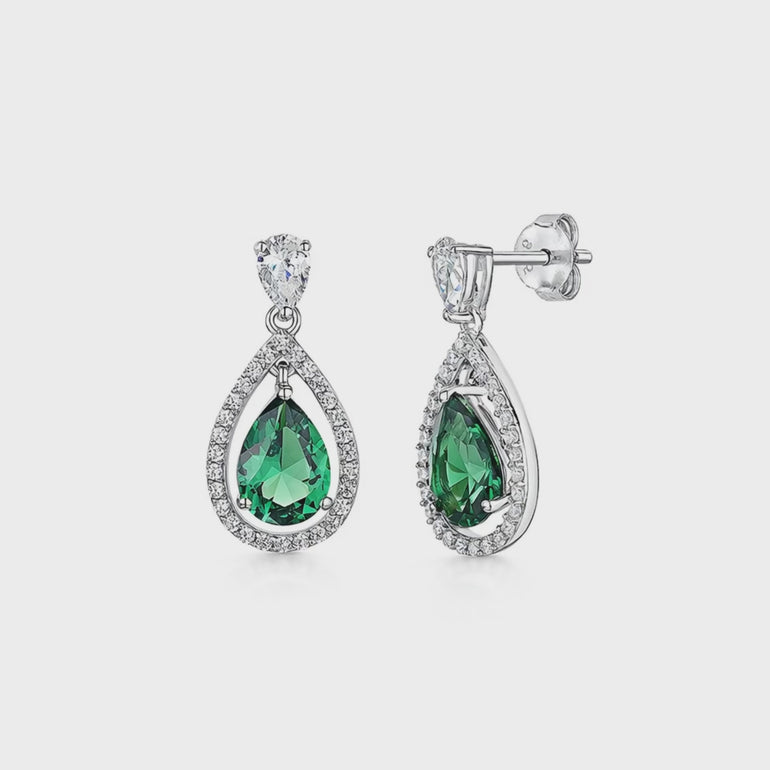 Sterling Silver Teardrop Earrings Set With 7x10mm Green Emerald And Halo Of 1.25mm Cubic Zirconia's. 4x6mm Pear Shaped Cubic Zirconia Bale. 24mm In Length. The Finest AAA Grade Cubic Zirconia Stones. 925 Silver - Hypoallergenic , Rhodium Finished For Tarnish Free Wear. Supplied With Gift Packaging.