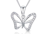 Sterling Silver Open Butterfly Necklace With A Cubic Zirconia Stone Set Surround. Set With 1.25 MM Stones .Overall Diameter 17 MM. The Finest AAA Grade Cubic Zirconia Stones. 925 Sterling Silver-Rhodium Finished For Tarnish Free Wear. Comes on a 16-18 inch Adjustable Chain. Comes With Gift Box And Bag