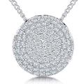 Sterling Silver Pave Set Circlular Dome Pendant Set With Cubic Zirconia Stones Set With 1.25, 1.5 and 2mm White Cubic Zirconia Stones. Overall Diameter 13mm . Rhodium finished- Tarnish Free.  Finest AAA CZ Stones. Comes on A 16-18 Inch Silver Chain. Supplied With Gift Box and Care Card