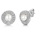 Sterling Silver And Freshwater Pearl Earrings In A Pave Style Concave Surround. Set With A Single 5.5 mm Freshwater Pearl.  Pearl Overall Diameter 10 mm. 925 Silver- Hypoallergenic.  Rhodium Finished For Tarnish Free Wear. Comes With Gift Packaging.