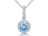 Sterling Silver Halo Pendant  Set With A Round Brilliant Sky Blue Centre Stone. 6 mm 1 Carat Equivalent . 19 mm Long. Comes on a 16-18 inch Adjustable Chain. 925 Silver- Hypoallergenic. The Finest AAA Cubic Zirconia Stones. Rhodium Finished for Tarnish Free Wear.  Supplied With Gift Packaging.
