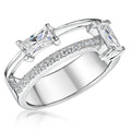 This distinguished sterling silver design presents an elegant split band adorned with two captivating emerald-cut stones. The sophisticated silhouette, measuring 6mm in diameter, features a row of meticulously pavé-set cubic zirconia stones (1.25mm) that catch light with every movement. Crafted exclusively with premium AAA-grade cubic zirconia and enhanced with rhodium finishing for enduring brilliance and tarnish resistance. Complete with a complementary ring sizer and presented in refined gift packaging for a truly luxurious experience.