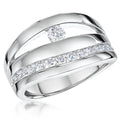 This exquisite sterling silver creation features three elegant bands united in a 10mm width design, crowned with a brilliant 3.5mm round cubic zirconia centerpiece. Complementing the focal stone, delicate 2mm pavé-set stones add refined sparkle. Crafted with premium AAA-grade cubic zirconia and finished with rhodium for enduring brilliance and tarnish resistance. Presented in sophisticated gift packaging with a ring sizer included for your perfect fit.